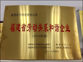 | 嘉泰數(shù)控:被授予“福建省勞動(dòng)關(guān)系和諧企業(yè)”榮譽(yù)稱號(hào) |