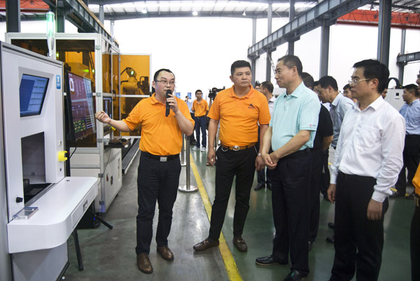 在參觀車間的過(guò)程中,嘉泰數(shù)控董事長(zhǎng)蘇亞帥向辛國(guó)斌副部長(zhǎng)一行介紹了公司的發(fā)展方向、產(chǎn)品技術(shù)、自主研發(fā)能力及產(chǎn)品的應(yīng)用領(lǐng)域和發(fā)展現(xiàn)狀,詳細(xì)匯報(bào)了公司近年來(lái)加快向“智能一代”邁進(jìn)、加快創(chuàng)新技術(shù)研發(fā)、深化產(chǎn)學(xué)研合作、積極承擔(dān)數(shù)控一代龍頭企業(yè)責(zé)任、深入推進(jìn)“互聯(lián)網(wǎng)”和“智能制造”方面的新舉措。聽(tīng)了蘇董的介紹,辛國(guó)斌副部長(zhǎng)勉勵(lì)嘉泰數(shù)控多對(duì)標(biāo)國(guó)際先進(jìn)技術(shù),借鑒成功經(jīng)驗(yàn),增加核心競(jìng)爭(zhēng)力,培育更多有自主知識(shí)產(chǎn)權(quán)和市場(chǎng)競(jìng)爭(zhēng)力的產(chǎn)品,探索工業(yè)發(fā)展創(chuàng)新模式,把推進(jìn)智能制造作為培育工業(yè)增長(zhǎng)的新動(dòng)力及提高生產(chǎn)效率和提升質(zhì)量的重要舉措,努力實(shí)現(xiàn)彎道超車。 智能制造示范車間里,擁有自適應(yīng)能力的智能機(jī)器人、智能檢測(cè)設(shè)備以及成熟運(yùn)用的數(shù)字化工廠平臺(tái)系統(tǒng)吸引了辛國(guó)斌副部長(zhǎng)一行。他詳細(xì)詢問(wèn)各個(gè)環(huán)節(jié)的技術(shù)關(guān)鍵點(diǎn),給出指導(dǎo)意見(jiàn),并鼓勵(lì)嘉泰數(shù)控要堅(jiān)持自主研發(fā),繼續(xù)創(chuàng)造中國(guó)style。辛國(guó)斌副部長(zhǎng)還仔細(xì)了解了嘉泰數(shù)控采用超聲波輔助加工及多種智能傳感器結(jié)合的新產(chǎn)品——超聲波加工中心,并與嘉泰數(shù)控相關(guān)項(xiàng)目的技術(shù)專家探討該設(shè)備針對(duì)特種材料加工的技術(shù)問(wèn)題,且當(dāng)場(chǎng)提出很多寶貴的指導(dǎo)意見(jiàn)。 國(guó)家工信部副部長(zhǎng)辛國(guó)斌與嘉泰數(shù)控相關(guān)項(xiàng)目的技術(shù)專家探討關(guān)于特種材料加工的技術(shù)問(wèn)題